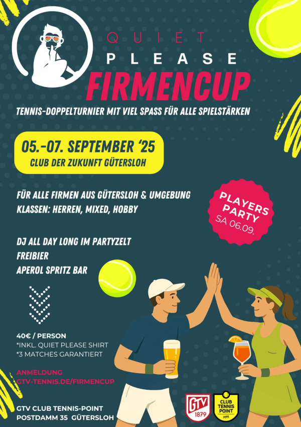 Vom 4. & 5. September 2026 lädt der GTV Club Tennis-Point Gütersloh zum sportlichen Highlight des Spätsommers: dem Quiet Please Firmencup – dem Tennis-Doppelturnier für Unternehmen aus Gütersloh und Umgebung. Teamgeist auf dem Court – mitreißende Matches für alle SpielstärkenOb ambitionierte Vereins-Spieler oder sportlich motivierte Hobby-Athleten – beim Quiet Please Firmencup steht der Spaß im Vordergrund! Jedes Firmenteam besteht aus 2–4 Spieler:innen und stellt ein Doppel. Es wird in verschiedenen Feldern gespielt – je nach Leistungsklasse (LK) oder ganz ohne LK-Einstufung in der Hobbyklasse.